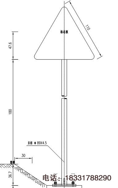 百分之八十以上的单柱式交通标志都是采用钢管89mm制作,采用热侵镀锌处理,常规尺寸立柱直径φ89mm*厚度4.5mm*高度3000mm,基础法兰盘400mm*400mm*10mm,地脚螺栓M20*L=710mm。其他常见尺寸有φ76、114、121、140、152、165、180、194、219等都是单柱式标志杆的钢管直径,高度则根据公路规划测量高度情况而定。一套标志杆是由立柱、底座法兰盘、基础法兰盘、底座加劲肋、地脚螺栓、螺母、标志牌、抱箍、滑动槽、反光膜等材料组装而成,基础挖坑采用混凝土浇筑,一般5-7天则可安装。