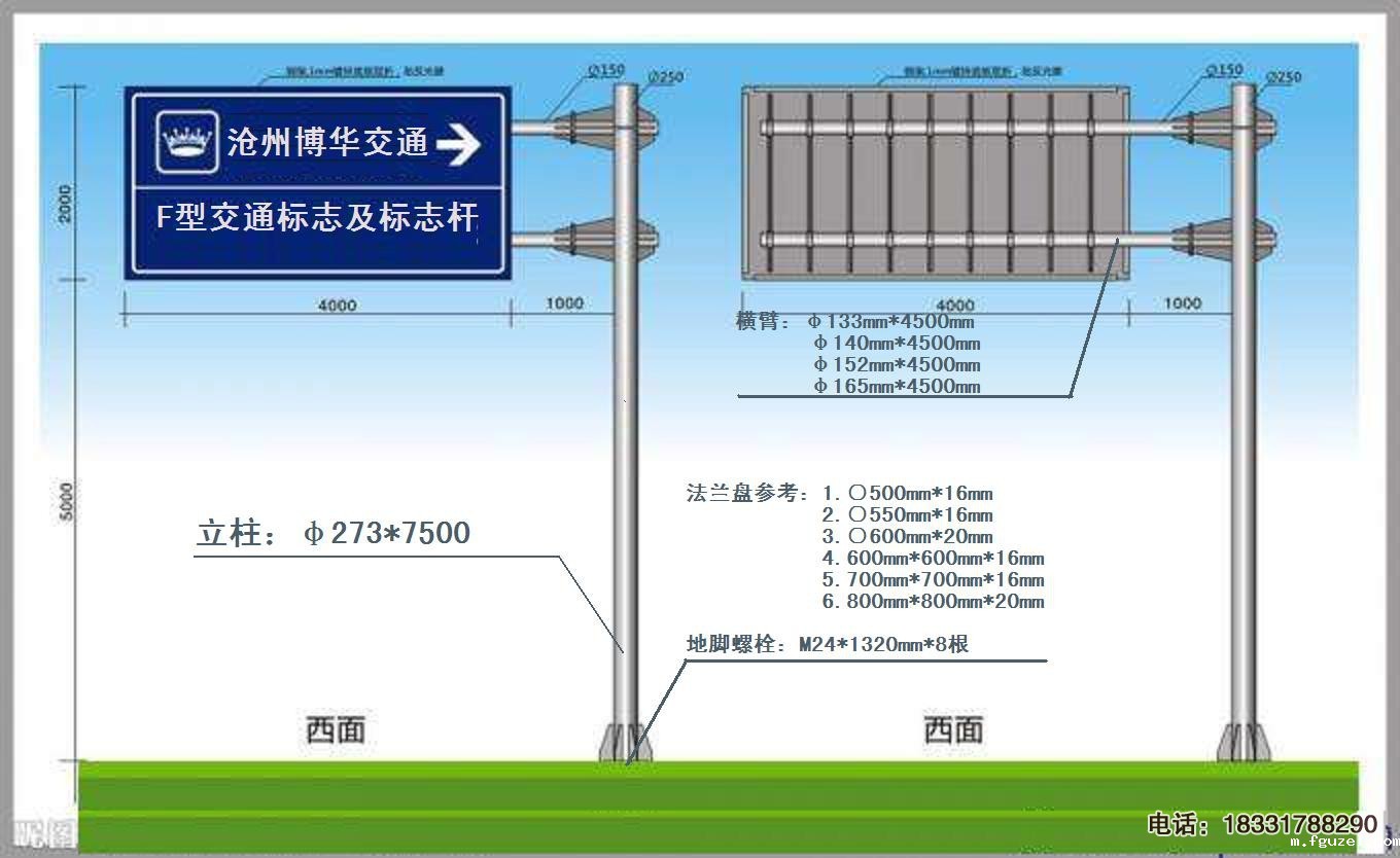 我国现用交通标志使用整根焊接钢管、无缝钢管或是方形钢管、矩形钢管作为支撑,支柱与基础通过法兰盘连接,保证标志杆的稳定的法兰盘分为上下部分。下法兰盘埋置于标志基础混凝土的表面,与混凝土中钢筋焊接成一体,以保证标志立杆的稳定。
